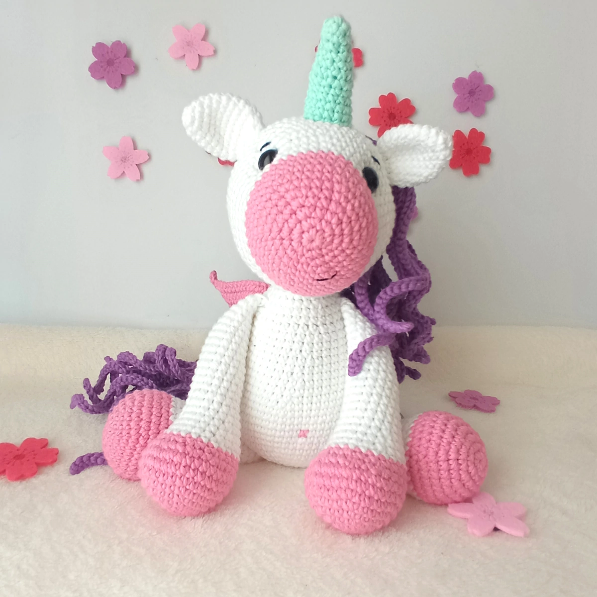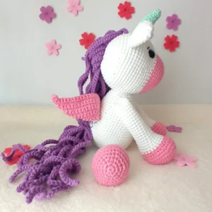 Hay personajes mitológicos que viven en los cuentos y en la imaginación, y este pegaso amigurumi pertenece a ese rincón dulce y mágico donde todo es posible. En cualquier mente infantil ya despierta fantasía, pero este caballito se lleva la palma, jiji. Con su hocico rosado, su cuerno color menta y esa melena larga, rizada y lavanda, este pegaso amigurumi está listo para convertirse en el compañero favorito de juego y abrazos.