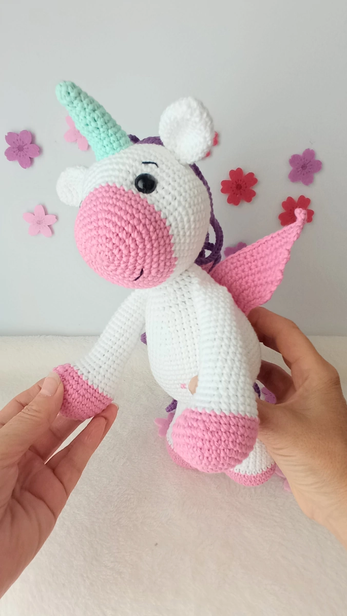 Hecho con materiales sostenibles y de alta calidad, este pegaso de ganchillo es una alternativa consciente frente a los juguetes industriales. Es suave al tacto, seguro para peques de cualquier edad y perfecto tanto para abrazar como para decorar. Al ser artesanal, cada pieza es única: pequeñas variaciones en el tejido hacen que tu Pegaso sea irrepetible, un tesoro personal con su propia historia tejida con cariño.